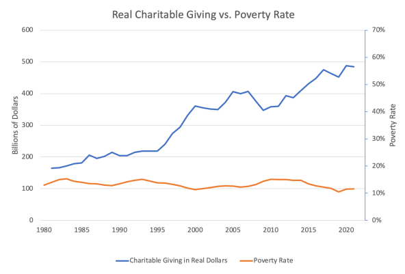 Changes in Charitable Giving and the Poverty Rate, 1980-2022 | Charitable giving in inflation-adjusted dollars grew dramatically, while the poverty rate remained largely unchanged. (Sources: