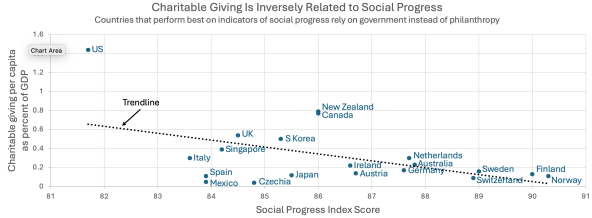 One could argue that social and environmental conditions would have worsened even more without philanthropic interventions. Philanthropy has funded numerous impactful programs that have aided many millions of people. Yet abundant evidence proves that philanthropy cannot solve societal problems on a national scale. Indeed, the United States leads the world by a wide margin in philanthropic giving per capita, but it ranks near the bottom of Organisation for Economic Co-operation and Development (OECD) countries on many measures of social well-being and at the top among many social ills. From 1990 to 2022, while real charitable giving doubled, the United States’ ranking on social progress compared to other countries dropped from 8th to 31st. This mismatch between charity and well-being is not limited to the United States. Countries with the highest per capita charitable giving—the United States, Canada, and the United Kingdom—tend to perform poorly on measures of social progress. The countries that perform best—Scandinavian countries, Germany, and Japan—give to charity as little as 2 percent of what the United States gives per capita, relying on government rather than philanthropy to meet their society’s needs.