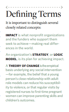 Indeed, most evaluations of social interventions require understanding the theories that mediate between inputs, activities, and outcomes.3 Theory-based evaluation requires understanding the steps embedded in a logic model of how an organization’s activities lead to impact. Even when the outcomes of social interventions can be evaluated through rigorous studies, the evaluators must know what variable to examine. Identifying the proper variables and metrics requires that one articulate the program’s goals and its underlying theory of change.4