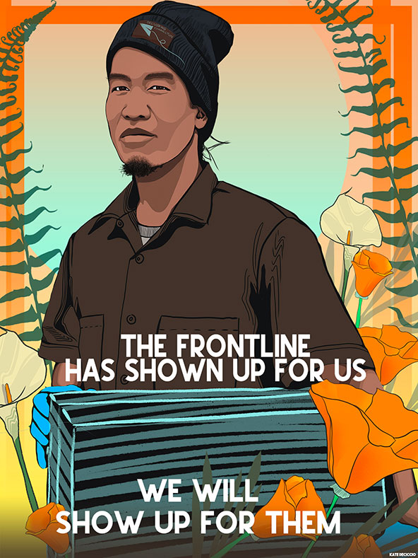 Art featured on Dearfrontline.com frames the heroes of the pandemic as front-line workers, priming society to fight for safe working conditions and fair compensation. (Image by Kate Decechio, courtesy of Big Bowl of Ideas)