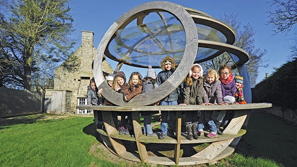 Children gather on the outdoor playground structure they helped design at Le blé en herbe school in Trébédan, Brittany, France. (Photo by Alain Pinoges courtesy of Fondation de France)