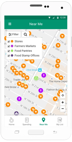 In addition to statement balance checks, FreshEBT offers visual aids—such as grocery lists and pie charts showing EBT transactions at different locations—and a location-based service that maps out nearby supermarkets, corner stores, and farmers’ markets that accept food stamps. The app’s grocery list allows users to enter a product’s name and price and then automatically updates the total balance.
