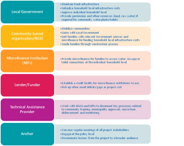 - The roles and responsibilities of key organizations that affect the success of a project and that can influence particular types of outcomes (see figure below). These include local government, participating families, microfinance institutions, community-based organizations, technical assistance organizations, and others.