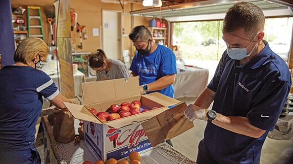 Medtronic employees participate in a food packing event for SEWA-AIFW, a nonprofit committed to family wellness in Minnesota.