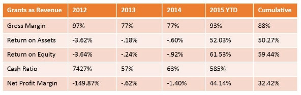 An Impetus to Improve Performance: Recasting the way cash inflows are reported forces leaders to focus on their organization’s profit and loss performance instead of on how much cash they have left in the bank to execute their plan. Focusing on what looks like a healthy cash position can foster a sense that there is plenty of time to build and execute on a business plan. And that false sense of security can stifle the urgency that would otherwise drive the organization to meet key milestone objectives. Reporting grant money as equity provides the impetus (in the form of a concrete metric) to improve performance and can push business leaders to focus on sales generation.