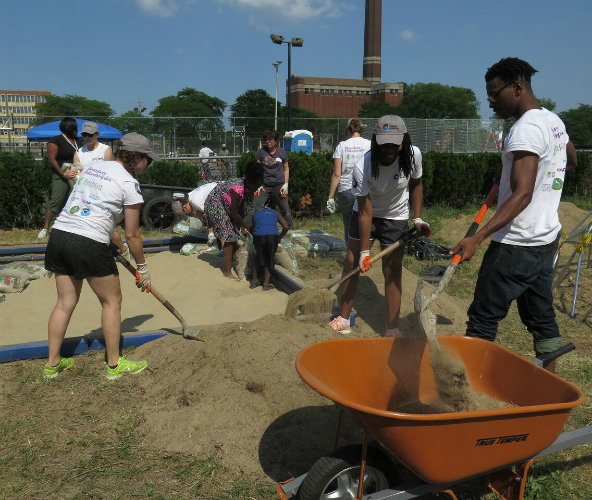 Members of AmeriCorps VISTA join city staff members and local volunteers to revitalize a hospital complex in Detroit. (Photograph by Hayley Kallenberg, courtesy of Cities of Service)