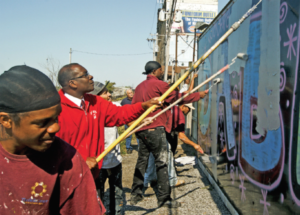 Byron Brown, mayor of Buffalo, N.Y. (center), helps Love Your Block volunteers in his city to paint over graffiti. (Photograph by Antwan Diggs, courtesy of the City of Buffalo, N.Y.)