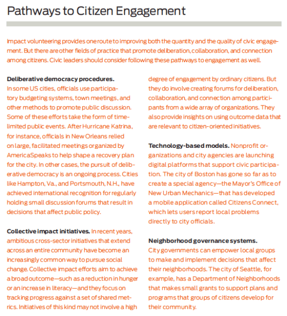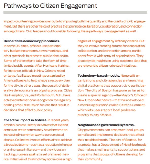 To meet the challenges that Americans currently face, communities in the United States need to increase the scale and the quality of citizen engagement. They need, in short, to begin an effort of civic renewal. So how can leaders and citizens begin that effort? People in various sectors have developed approaches to answering this question. But impact volunteering, we argue, offers an especially compelling answer. By enabling volunteers to deliberate, collaborate, and connect—by enabling them not only to contribute hours of service but also to take part in planning and initiating civic improvements—communities can transform those volunteers into engaged citizens.