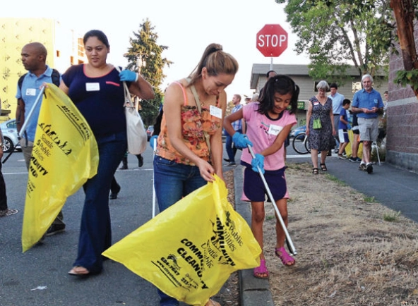 Citizen volunteers pick up litter during a Find It, Fix It walk in the Lake City neighborhood of Seattle. (Photograph courtesy of the City of Seattle)