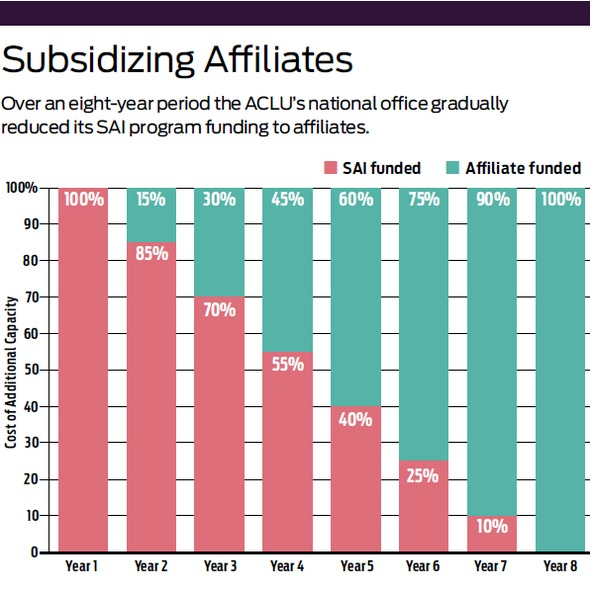 A key difference in the SAI structure is that it was funded largely by individual donors in non-SAI states, such as New York and California, who recognized the strategic need to build support for civil liberties in states such as Texas, Mississippi, and Florida. Affiliates and donors alike understood the need to bypass the usual sharing formula for this initiative.
