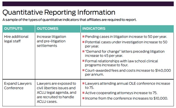 As we prepared to put in place the most ambitious investment ever undertaken by the ACLU, we knew we had to establish several transparent mechanisms to keep all stakeholders informed and on track. First, we needed budgeting processes that ensured accountability. Second, we needed a quantitative and qualitative reporting structure that would demonstrate the value added by the program and allow for recalibrations along the way. Third, we needed a way of demonstrating to our donors and stakeholders, and to the affiliates themselves, the impact of the new, disciplined approach.