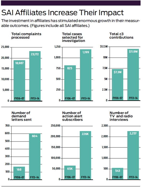 Over the last 10 years, SAI investment in affiliates has stimulated enormous growth in virtually all areas that we measure, such as complaints processed, financial contributions, and TV and radio interviews. (See “SAI Affiliates Increase Their Impact.”) The 11 SAI affiliates now collectively boast nearly 200 new staff members, an increase of 53 percent over their pre-SAI sizes.