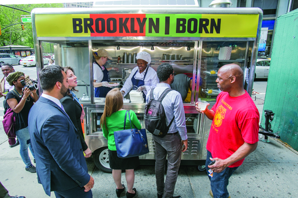 In May 2015, patrons gather around a new food cart, one of a fleet of solar-powered carts that Move Systems is rolling out in New York City. (Photo courtesy of Move Systems)