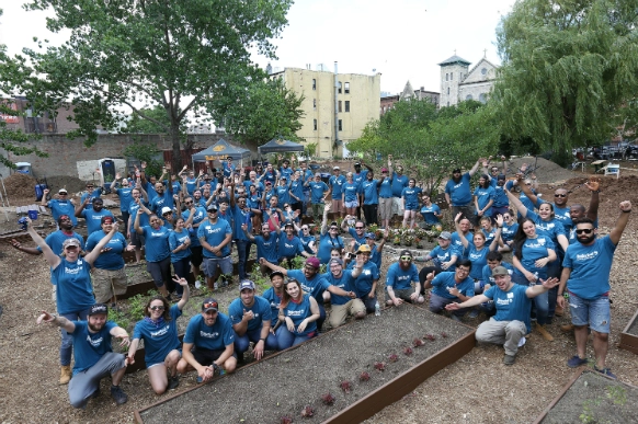 In June 2016, 100 employee and business partner volunteers, organized by the outdoor footwear and apparel company Timberland, spent a bright and sunny day reviving the United We Stand Garden in the Mott Haven neighborhood of the Bronx in New York City. In the wake of a damaging fire, what had once been four separate community gardens had become one large lot strewn with trash. The volunteers created 30 raised garden beds from recycled plastic lumber, built pathways to improve garden access, moved a shed, created a space for a mural, and built a performance space and benches. These efforts helped restore the area as a shared community gathering space and garden to support urban agriculture for local residents.