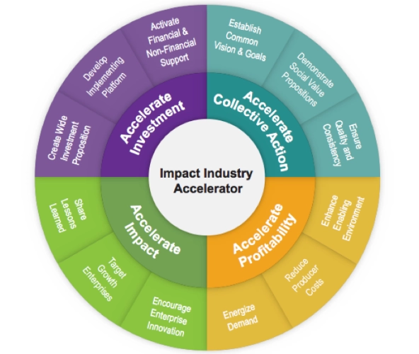 1. Accelerate Investment: Before the Alliance could do anything meaningful, both financial and non-financial resources were needed. While initially these resources came from various players in the development sector, the source of this investment has changed over time to include some private sector support. These investments were generally funneled through the Alliance but could also be provided directly to other organizations collaborating in industry acceleration efforts. Success in this stage of acceleration can be measured by the level of resources mobilized for the impact industry.