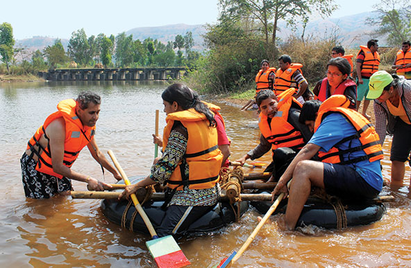 ABBF founder Divyanshu Ganatra assists participants during a raft-building activity in Pune, India, in 2017. (Photo courtesy of Adventures Beyond Barriers Foundation)