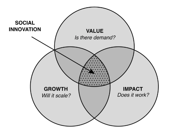 If your goal is the destination, and your agility enables you to accelerate, break, and steer, what remains are your markers of progress—the directions, signposts, and landmarks that will help you navigate your way there. For successful social innovation, we need to pay attention to and optimize across three dimensions: value, growth, and impact. While the ever-expanding array of innovation tools tend to be based on the same underlying best practices, they each tend to emphasize some a subset of the three.