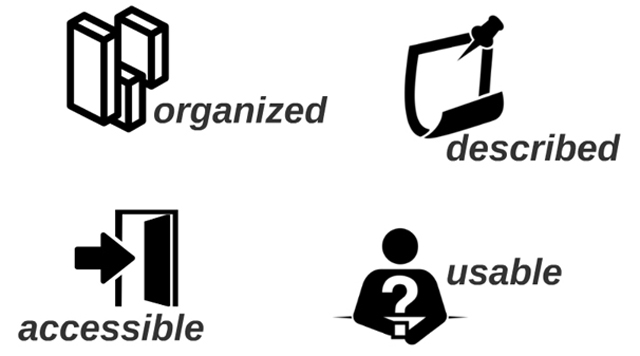 How do you accomplish these four things? There are lots of options; you have to pick one that fits the needs of your team. Random spreadsheets scattered between people's computers aren't organized, well described, or accessible. A central file server (such as SharePoint or Dropbox) might help make these files more accessible, but without templates or standard formats they won't be well described or usable. A web-based portal (such as ckan or Socrata) will certainly make data more usable, but it might not guarantee that all of it is well organized.