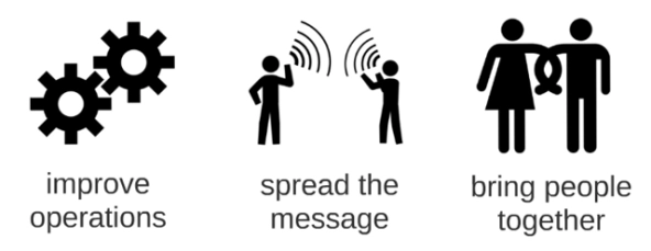Remember that data is an asset that can help you do your work more effectively. You want to build architectures within your organization so that your use of data aligns with your goals and mission. Don't do data for data's sake! Some examples: Use your data to monitor your operations (remember Sally and her "engagements" on Facebook), or in external communications to spread the message by advocating and communicating about your issue in new and visually appealing ways. You can also bring people together around data, analyze it in creative and fun ways, and find stories to tell with it (maybe even design and paint a data mural or two).