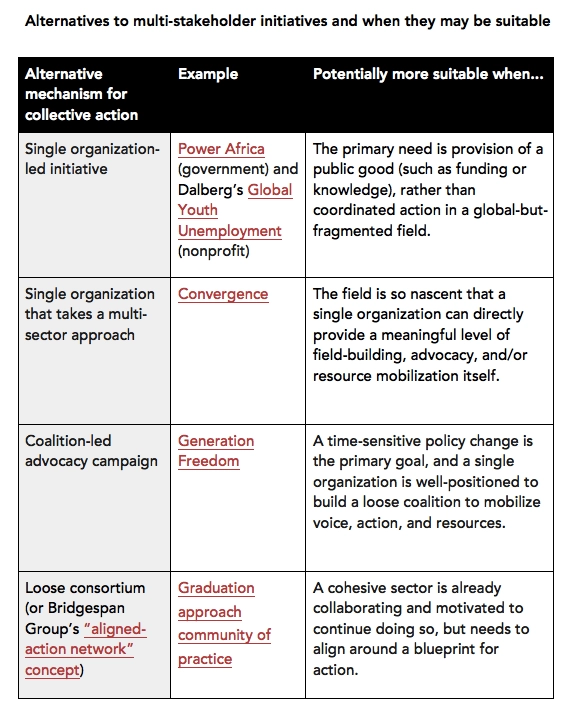 The number of multi-stakeholder initiatives (MSIs) in the social impact space has increased dramatically over the past few decades, beginning in the 70s with the Consultative Group for International Agricultural Research, followed by a considerable uptick in the 90s. Known by many names—including coalitions, public-private partnerships, and alliances—these types of organizations naturally appeal to those seeking transformative change. They offer a powerful model to solve increasingly complex global development problems, particularly because they bring together stakeholders across sectors, influence ecosystems, and create impact at meaningful scale.