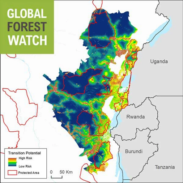 Machine learning and spatial modeling identify the main drivers of forest loss and predict its likely future locations in the Democratic Republic of the Congo. (Image courtesy of Global Forest Watch.)