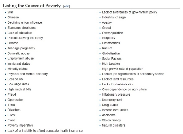 Above is the list of poverty’s causes that appears on Wikipedia. The list is fascinating. It includes war, disease, racism, dictatorships, disasters, overdependence on agriculture, lack of industrialization, domestic abuse, and teen pregnancy. Are these the causes of poverty? Did these things bring poverty into existence?