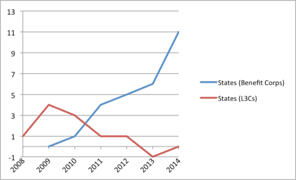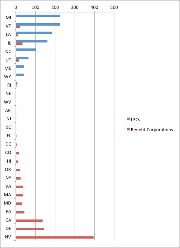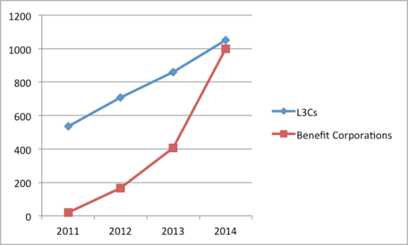 As of July 2014, we counted 998 benefit corporations in the United States from Secretaries of State (SOS) office lists and 1,051 L3Cs counted by InterSector Partners as of July 31, 2014. For purposes of comparing these two numbers, it is interesting to note that rates of LLC formation are typically much greater than C-corporation incorporation rates.