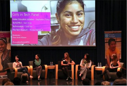 Representatives from the Microsoft Silicon Valley Community of Learning participate in a panel presentation on “Girls in Tech” at the Innovation Forum. (Photo by Thea Nilsson, Microsoft)
