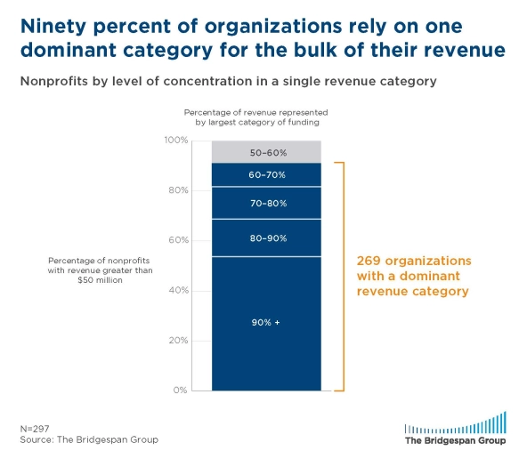 Over 90 percent of the 297 nonprofits with $50 million or more in revenue had a dominant category of revenue—and on average that category accounted for 90 percent of total revenue. These statistics are unchanged from our 2007 study, showing a remarkable consistency on this fundamental rule of how nonprofits get big. It is concentration on a single revenue category, not diversification across multiple categories, that is overwhelmingly the path to growth.