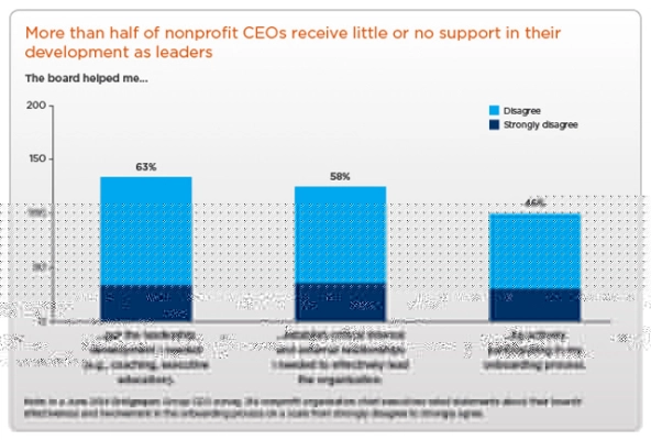 Such comments were not the exception. Overall, survey respondents portrayed nonprofit boards as frequently disengaged or ill-equipped to effectively support their new leaders. “The board assumed I knew what I was doing, and there was effectively no training at all,” says one executive director recruited from a for-profit organization. “Having never been an executive director before and having never worked in a nonprofit, I had no idea what I was doing.” Anecdotes and data tell the same story: When it comes to managing the senior executive, nonprofit boards underperform.