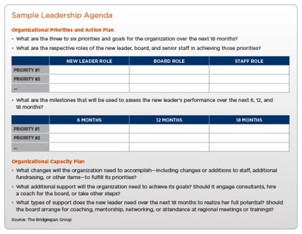The leadership agenda should clarify the organization’s priorities; develop action plans, roles, and milestones for each priority; and identify gaps in organizational ability or capacity to achieve them. Building the leadership agenda should be a dynamic process; it should start with an emerging vision set by the board before the new leader arrives and then get jointly fleshed out with the CEO as that person learns about the organization during the orientation process (see recommendation 4). The template below provides an outline of what a leadership agenda could look like.