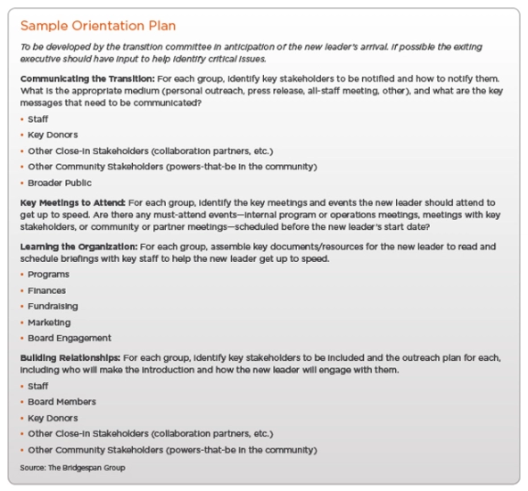 To ensure that the new CEO has time and space for these activities, the board needs to make orientation a priority. That means the board should keep some day-to-day duties off the new leader’s plate at the outset. “Too many leaders are fighting fires from day one, and they miss a critical window to understand and assess the organization and build strong relationships,” says Tim Wolfred, author of Managing Executive Transitions: A Guide for Nonprofits. “As a result, they get off to a limping start and could end up playing catch-up for years.”