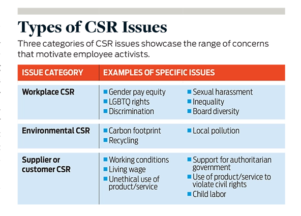 Employee activists are motivated by concerns about social problems that are often connected to their employer. In most cases, these problems correlate with leading CSR issues. Workplace CSR includes company policies that affect diversity and inclusion for traditionally underrepresented groups, such as women, racial minorities, and LGBTQ workers. Environmental CSR spans issues from global carbon pollution to local community recycling. Employee activists are also concerned about business dealings with certain suppliers and customers—such as those that themselves have poor CSR records, or that are using the organization’s products and services to violate citizens’ rights.