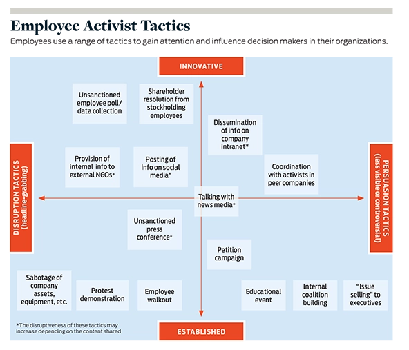 Disruption tactics include sabotage—from damaging a company’s valuable assets (such as factory equipment or its website) to sullying its reputation by sharing disadvantageous internal information with external NGOs who then publicize it via social media. The persuasion end of the spectrum includes tactics like internal “issue selling” to senior executives, by deftly articulating the merits of enhancing a company’s CSR engagement. Certain tactics, such as employee walkouts and sit-ins, may be more disruptive for manufacturing plants or hospitals that operate 24 hours per day and less disruptive for organizations that are not as dependent on the continuous presence of their workforce.