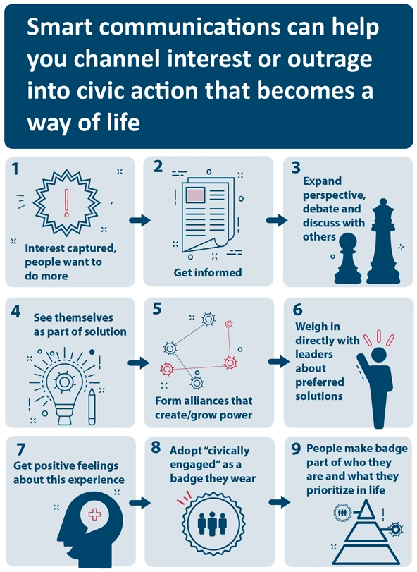 This leads directly into the next critical step of making civic engagement a way of life: giving people immense satisfaction from getting involved. This happens when you cultivate feelings of pride and success.