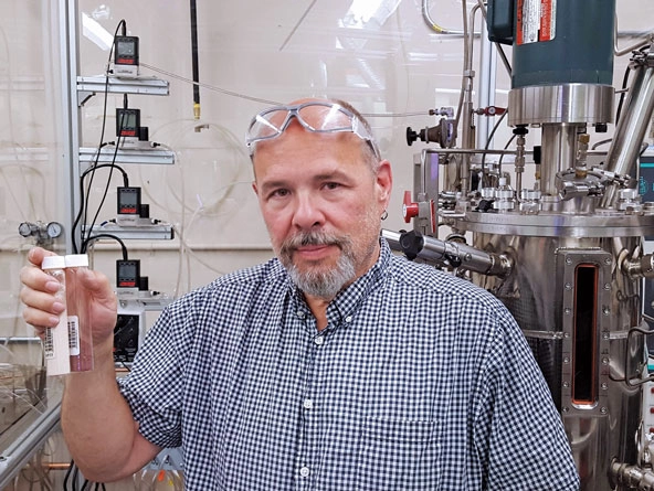 Technology Officer Brian Sefton holds vials of the feed products in the Sunnyvale, California, lab. (Photo courtesy of NovoNutrients)
