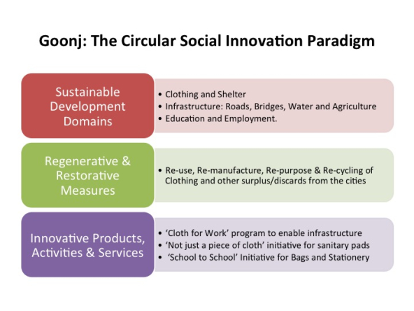 HelpUsGreen is just one social enterprise enabling the circular economy through social innovation in India. Goonj, which means “echo” in Hindi and was started by Anshu Gupta in 1998, takes discarded and underutilized materials like clothes, furniture, household appliances, and school materials from larger Indian cities and uses them to address basic needs among the rural poor. Under its flagship initiative called Cloth for Work, Goonj puts more than 3,000 tons of materials to use, initiating and implementing more than 2,000 developmental projects each year. These projects create long-term impact in areas such as improving sanitation and health, building infrastructure, and facilitating income-generating activities among marginalized people. Another initiative of Goonj, called Not Just a Piece of Cloth, has meanwhile distributed more than six million sanitary pads made from used cloth to remote villages to improve women’s health.