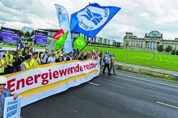 on June 2, 2016, holding a banner with the written slogan “Energiewende retten!”(“Save energy transition!”). (Photo by Markus Heine via Getty Images)