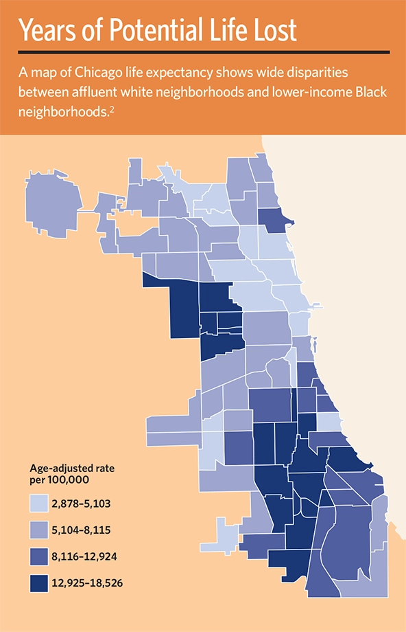 Some very alarming statistics reveal population-level disparities within our social and health-care systems. One prominent example is the 30-year gap in life expectancy between people living in the poor, predominantly African American neighborhoods on Chicago’s South Side, as compared to those in the more affluent, predominantly white neighborhoods just nine miles away in Chicago’s Loop. This is the largest life expectancy gap in the United States, according to the City Health Dashboard,2 and is attributable to few economic opportunities and high rates of obesity, diabetes, hypertension, heart disease, and stroke in South Side neighborhoods.3 The origins and ramifications of this wide difference in life expectancy are deeply, systemically entrenched and must be acknowledged if we are to effectively close the gap.