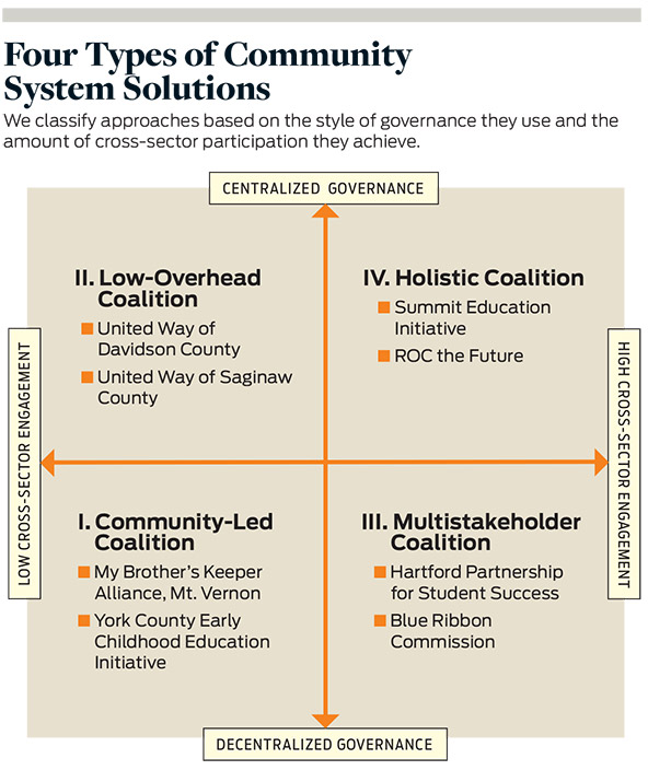 The community system solutions framework is informed by two lines of academic research that predate the conceptualization of the collective impact model. The first line describes the different ways in which cross-sector collaborations between businesses and nonprofits and between nonprofits and governments occur. It focuses on what kinds of organizations participate in cross-sector partnerships and how they integrate their activities.1 The second line of research describes how coalitions are most commonly governed.2 It introduces three forms of governance: network administrative organizations, lead organizations, and self-governance. Network administrative organizations are similar to the backbone entities of the traditional collective impact framework. That is, they are independent bodies with their own dedicated staff that coordinate the activities of a network. In lead organizations, by contrast, a participating organization steps in to coordinate. In self-governed networks, the members of the coalition share governance responsibilities.