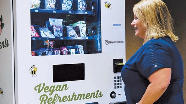 Jen Helt, a specialist in the emergency department at Dupont Hospital in Fort Wayne, Indiana, scopes out the selection of vegan products available for purchase. (Photo courtesy of CPNJ Vending)