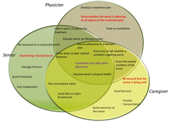 In the example above, one of the issues that both caregivers and seniors find on the job of “coordinate care” is difficulty knowing what they are responsible for communicating—for example, what they need to tell the physician versus what is in the medical records. Internally, an important issue that health care providers must examine is that there is no “captain of the ship” when it comes to coordinating care for a senior with multiple medical issues.
