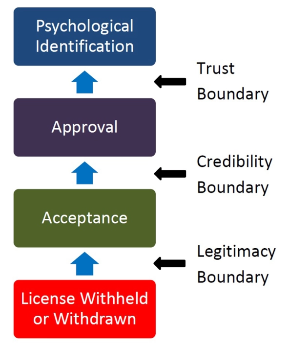 The Social License to Operate has multiple levels, reflecting the increasing legitimacy of an organization’s activities. (Image by Krystian Seibert, adapted from socialicense.com)