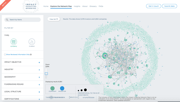 The map demonstrates the publicly available transactions between investors and companies within impact investing. We believe that by bringing the connections between actors to life—looking specifically at the investments that connect them—we can foster a better understanding of the size, breadth, depth, and, importantly, the enormous potential of this field.