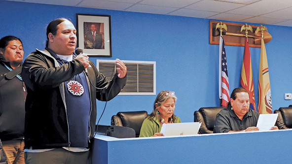 NDN Collective President and CEO Nick Tilsen speaks about transitioning to sustainable forms of energy at the Cameron Chapter House during a visit to the Navajo Nation. (Photo by Jade Begay)