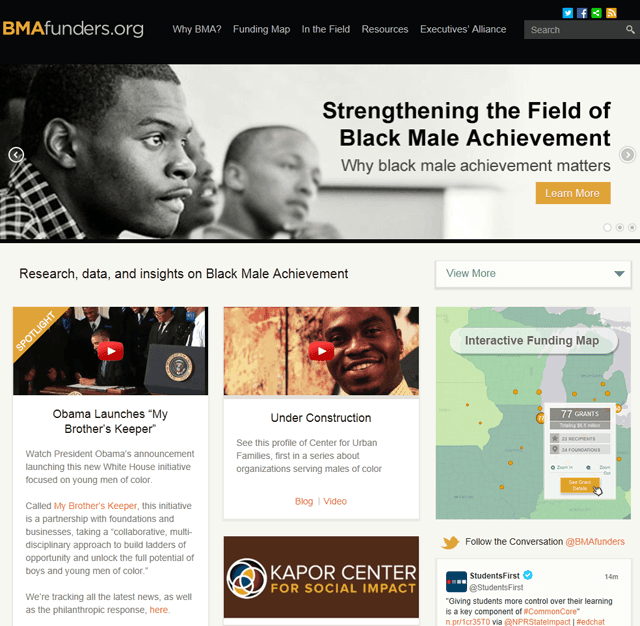 There is hope on the horizon. Companies like Foundant and FLUXX are beginning to pull transaction data from the Foundation Center directly into their grants management software. The Gates Foundation is experimenting with making every type of contextual data its program staff could ever need available through an in-house platform. Affinity groups like Media Impact Funders and coalitions of funders working on issues such as access to safe water and black male achievement (see image below) are making transaction and contextual data available on public-facing web portals. And IssueLab, a service of the Foundation Center, is making thousands of evaluations, lessons, and best practice documents available and searchable to begin to get at the elusive questions of impact. These are but a few of a growing series of initiatives.