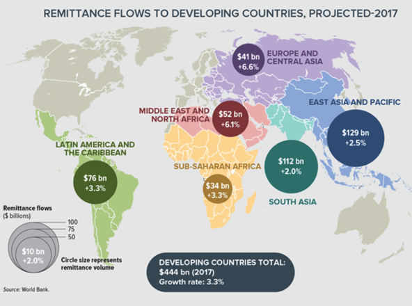 Some organizations are using blockchain technology to reduce the cost of remittances transferred across borders by migrant workers, which total about $440 billion annually—nearly three times the amount of international aid provided to developing countries each year. Currently it is estimated that at least $32 billion in remittances is failing to reach recipients, due to high transaction fees associated with sending and receiving money internationally.