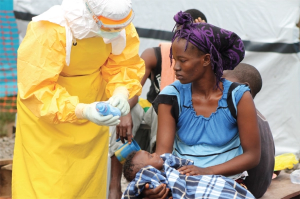 the Ebola epidemic in West Africa, a woman and her child receive aid from an MSF team member in Foya, Liberia. (Photo courtesy of MSF France)