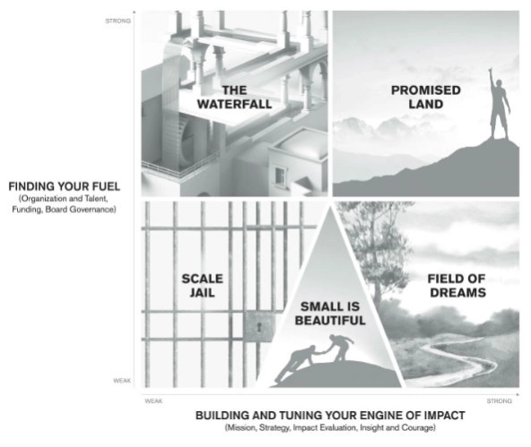 Field of dreams: Yet other organizations have a well-built engine, but they need to generate certain types of fuel to scale their impact. In our survey, 27 percent of organizations fell into this category. These organizations are poised to scale, and indeed the future of the nonprofit sector as a whole depends on their capacity for building on the solid foundation they have created. They need to assemble the essential elements of strategic management—recruiting talented executives and staff members, attracting steady support from donors, and mastering the art of board governance.