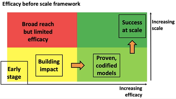 Attaining efficacy is a prerequisite to successful scaling and a necessity for long-term organizational stability. But budding organizations are less likely to reach their goals by increasing program efficacy and scale simultaneously, let alone scaling prior to demonstrating efficacy (as with the “10 cities in 10 years” mistake cited above). Organizations should focus deeply on efficacy first—at a smaller scale and, potentially, for a long time—before scaling up.